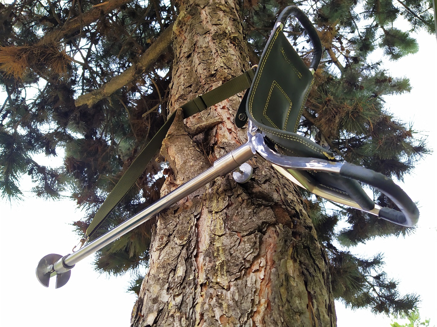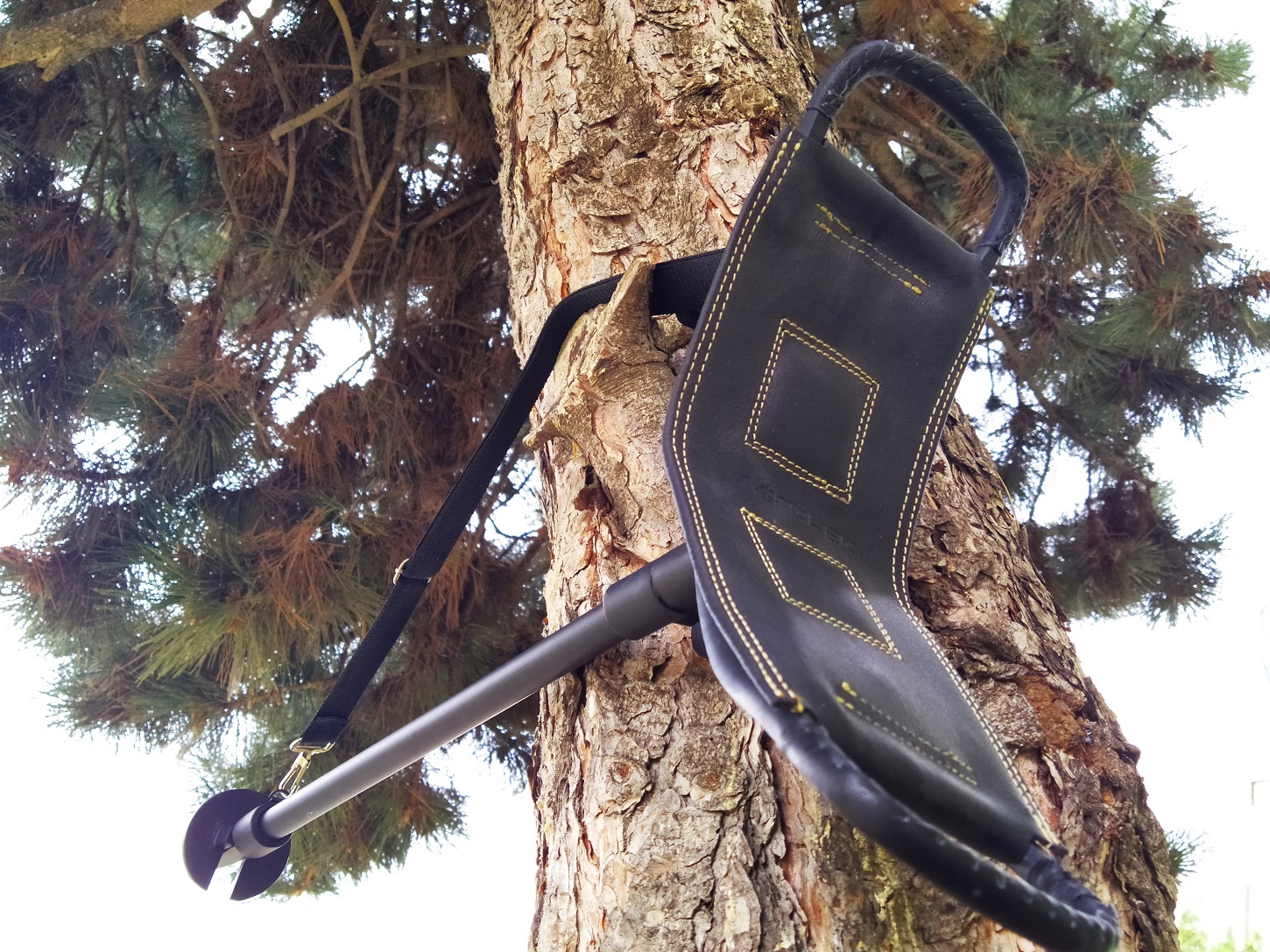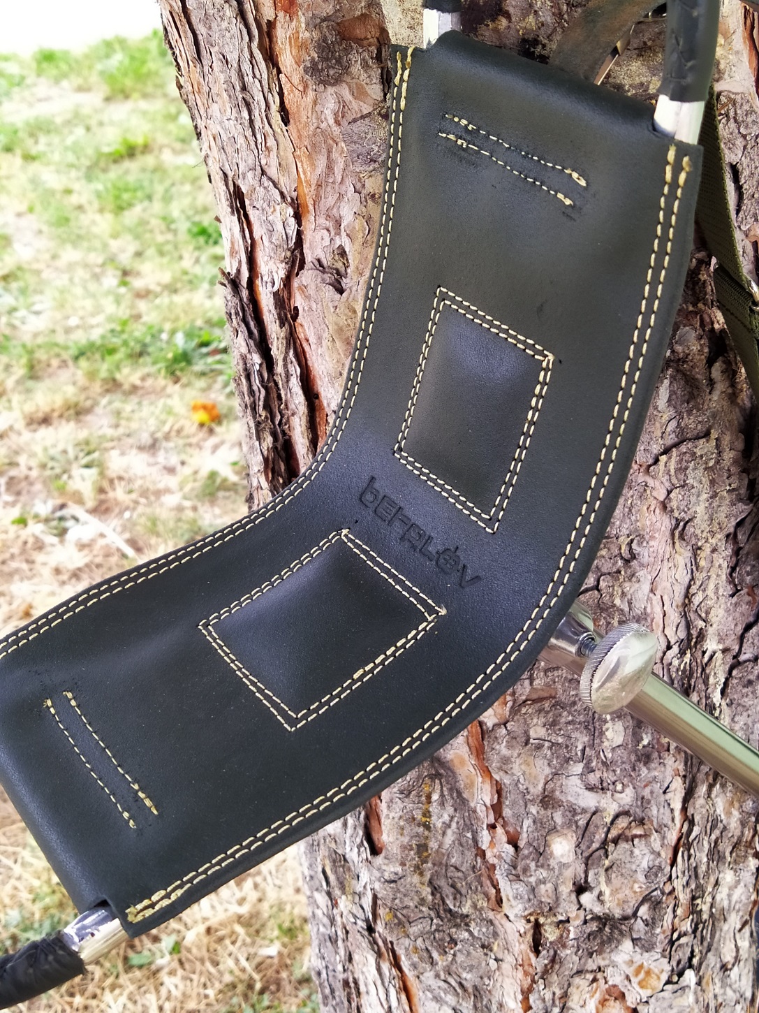 Height adjustable metal chair with leather seat.