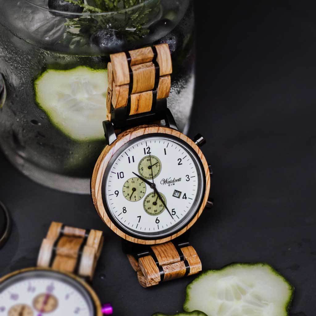 The wooden chronograph "Gin Cucumber" watch has distinctive green elements on the dial. Gin watches from Waidzeit should highlight the time to something special and emphasize th