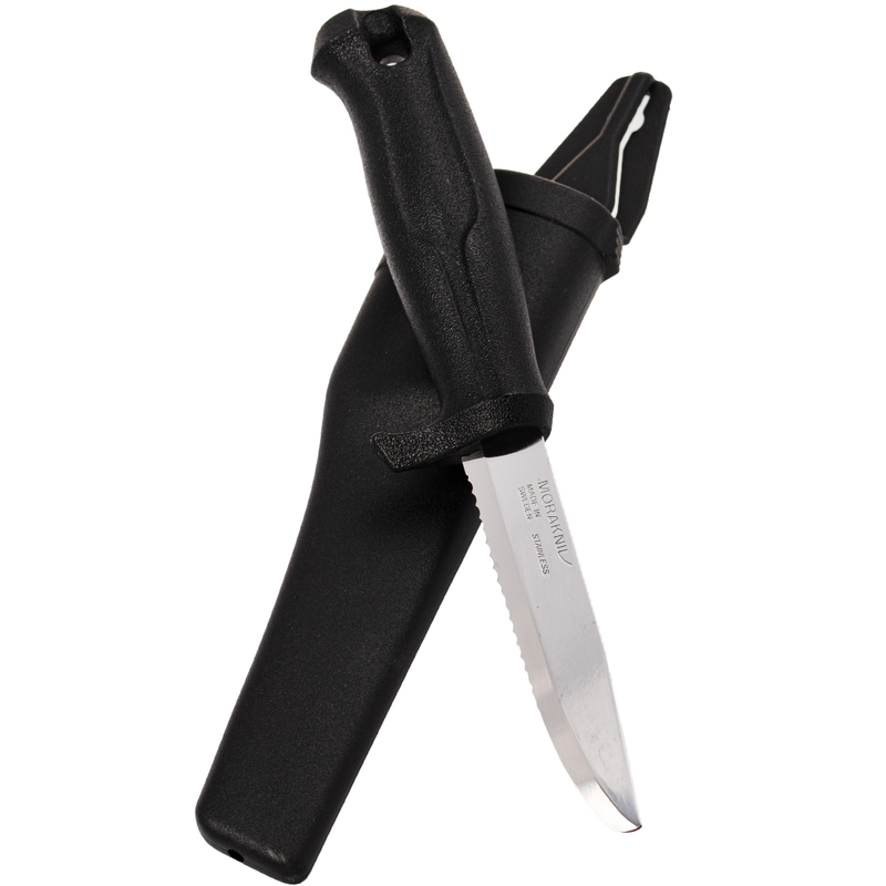 The blade is made of stainless steel, has teeth for faster cutting of different materials./Lano, net.../But it can be used for cutting and gutting fish.The handle is robust, made of polymer and adapted to work at sea and on the water.Of course there is a finger guard to prevent slipping of the fingers on the blade.
