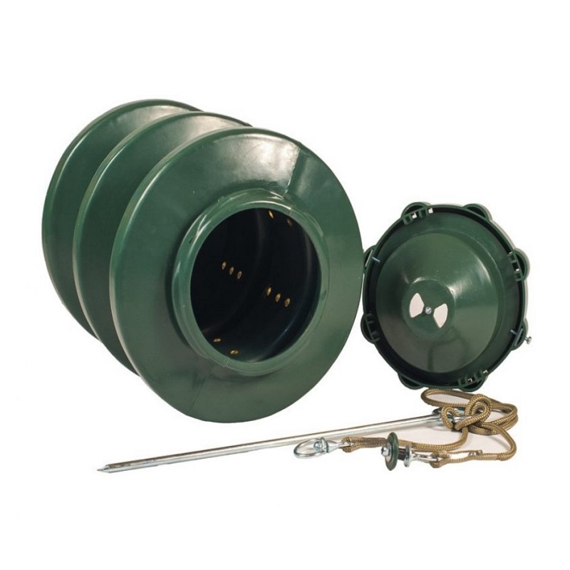 The plastic feeding drum is used for feeding wild game, but especially wild boar. The hopper is built to hold approx. 30 litres of corn, which is protected from birds and rodents, saving food for the game you want to