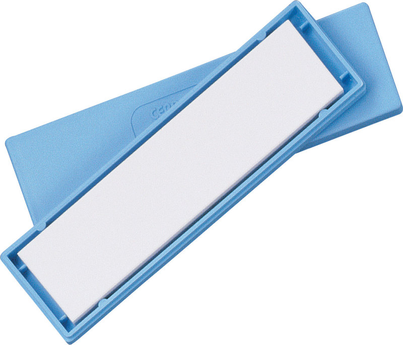 Made of ultra-hard alumina ceramic material and a fine-grain Spyderco lacquer used as a traditional whetstone, but does not require oil or water. Its wide, flat surface is ideal for sharpening woodworking tools and all types of knives and can be easily cleaned with household cleaner, a degreasing pad and water. This stone comes in a light blue polymer case with non-slip rubber feet.
